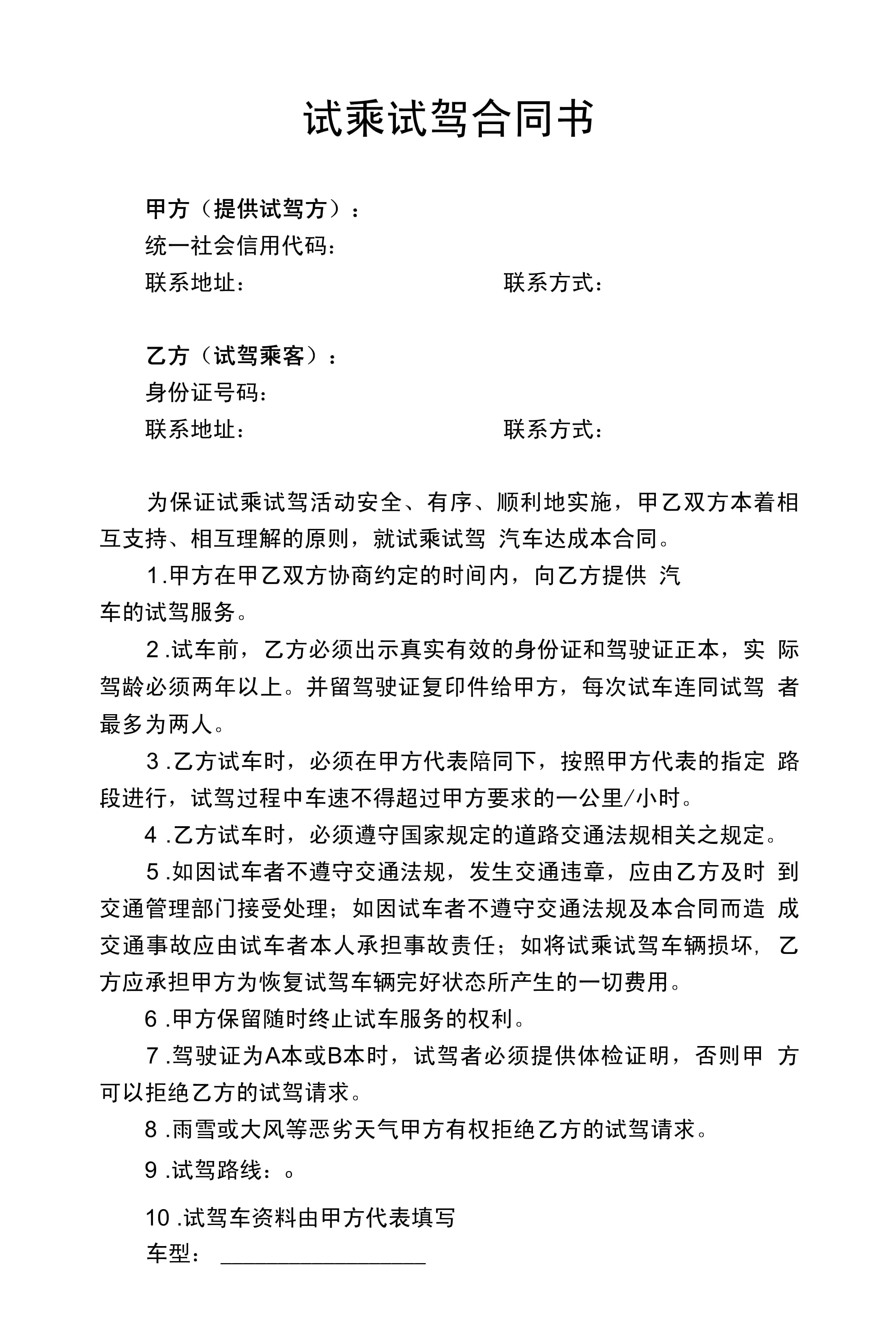 以下为试乘试驾协议的范本,理论上除试驾者有主观严重交通违法行为才应当承担全部责任;非主观造成的交通事故,其后果连商业保险也是在承保范围内的,没有要求由试驾者承担一切后果的客观理由。