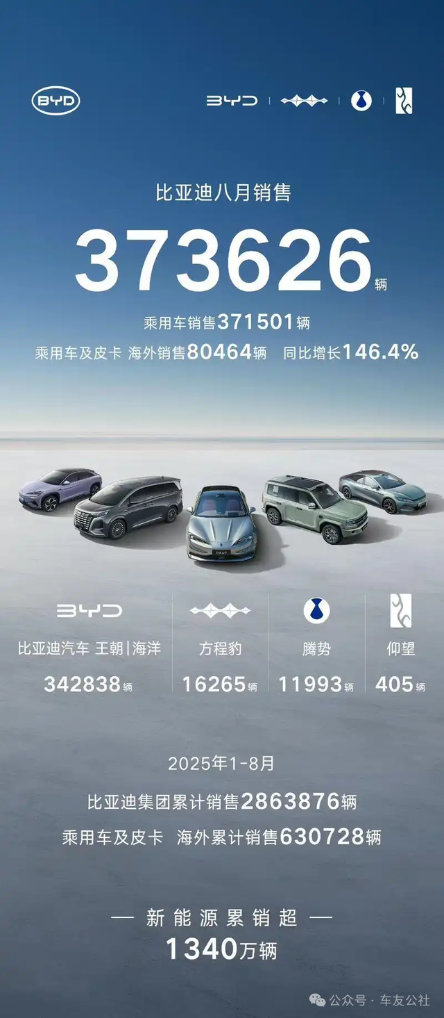 1.销量增速显著放缓:2025年前8个月,比亚迪国内销量同比下降14%,而海外销量虽增长157%但基数较低(8月海外销量8万辆)。按原目标550万辆计算,前8个月目标完成率仅52%,下半年需月销超60万辆才能达成,实现难度极大。
