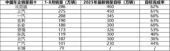 从今年1-8月份销量前十的中国车企数据来看,行业头部阵营格局清晰。比亚迪以 286 万辆的累计销量稳居榜首,在25年度460万辆最新销量目标中完成率达 62%,在新能源赛道持续领跑;吉利汽车表现亮眼,190 万辆的销量实现 300 万辆年度目标的 63%,完成率位列前十车企首位;上汽、一汽、长安分别以 275 万辆、208 万辆、180 万辆销量,达成各自年度最新销量目标的 61%、60%、60%,凭借全品类布局与新能源产品落地,维持规模优势。