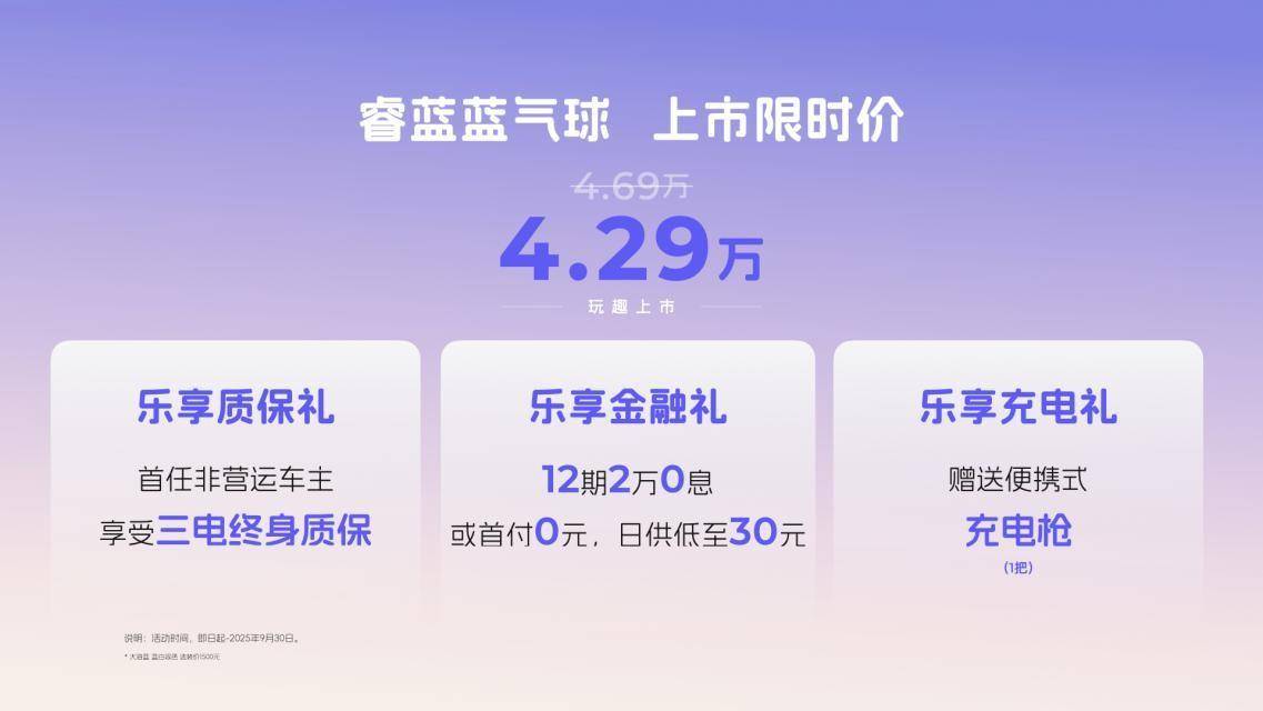 同时,睿蓝蓝气球在上市之际也推出多重惊喜好礼,涵盖首任非营运车主享受三电终身质保、12期2万0息或首付0元,日供低至30元金融礼、赠送1把便携式充电枪,进一步减轻用户拥车压力。即日起,消费者可通过睿蓝汽车官方APP、小程序或授权经销商渠道了解详情、预约试驾,并可享首批车主专属礼遇。