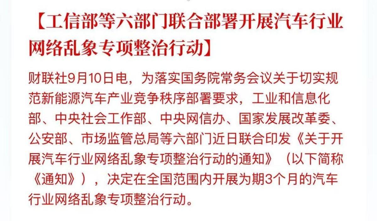 前两天,工信部、中央社会工作部、中央网信办、国家发展改革委、公安部、市场监管总局等六部门联合印发《关于开展汽车行业网络乱象专项整治行动的通知》决定在全国范围内开展为期3个月的专项整治行动。