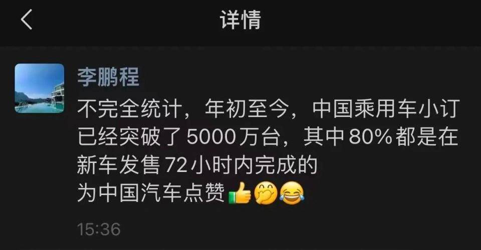 后有阿维塔的前高管李鹏程,在朋友圈用数据抨击这一现象:“据不完全统计,年初至今,中国乘用车小订已经突破了5000万辆,其中80%都是在新车发售72小时内完成的。”