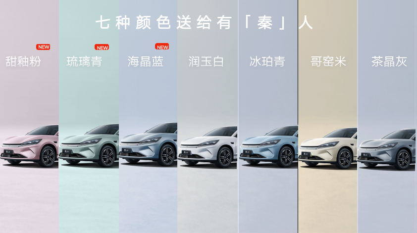 同时,为满足更多用户不同的个性化审美需求,秦L EV全系新增三款富有生命力的全新配色。甜釉粉,是专属于情侣的“心动讯号”,粉中带蓝,温暖甜蜜,车身自带“柔光滤镜”,让人一眼心动;琉璃青是献给年轻人的“气质杀”,以古法琉璃的通透为底,如雨后初晴的天空,通透又富有层次;海晶蓝是送给生活冒险家的“自由宣言”,车色如海浪随角度不断变幻,展现出玻璃棱镜效果,随手一拍就是大片。