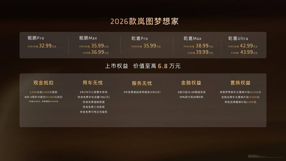 9月15日下午,2026款岚图梦想家(参数|询价)正式上市,发布了鲲鹏和乾崑两大智能化系列,五大配置版型,以及PHEV和EV两种动力模式,官方指导价格为32.99万至43.99万,同步推出多项权益政策。