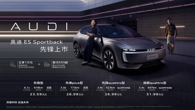 2025年9月16日,广州 – 奥迪 E5 Sportback正式上市,全系推出先锋型、先锋plus型、先锋quattro型和旗舰quattro型共4款配置车型,臻享价23.59万起,并享万元保险现金权益,意味着E5 Sportback正式进入22万级区间,上市即开启交付。