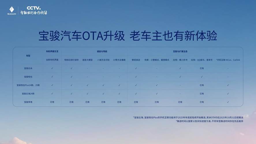 2025年10月31日前,宝骏汽车五款车型将陆续OTA最新灵语座舱体验。宝骏云海2024款、宝骏悦也、宝骏悦也Plus2024款及2025款、宝骏云朵,将迎来全新的车机界面交互、导航、壁纸等网联功能,界面更美观,体验更个性。此外,宝骏享境将新增HiCar、Carlink手机互联,让互联无界。宝骏云海、宝骏悦也Plus也将在今年年底升级全新手机互联,畅享丝滑手机互联体验。