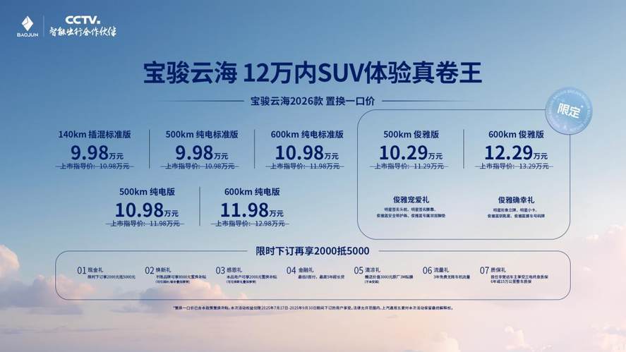 在同级别市场中,宝骏云海2026款兼具高颜值设计、舒适空间、长续航与全场景智能配置,是“12万内SUV体验真卷王”。在配置焕新与体验升级的同时,宝骏云海2026款在价格与福利方面同样诚意满满。宝骏云海2026款共有140km插混标准版、500km纯电标准版、600km纯电标准版、500km纯电版、600km纯电版5款配置可选,官方指导价为 10.98万元–12.98万元;俊雅版有500km及600km配置可选,官方指导价为 11.29万元-13.29万元。为回馈广大用户,宝骏特别推出诚意福利,宝骏云海2026款可享置换一口价低至9.98万起,俊雅版置换一口价低至10.29万元起。