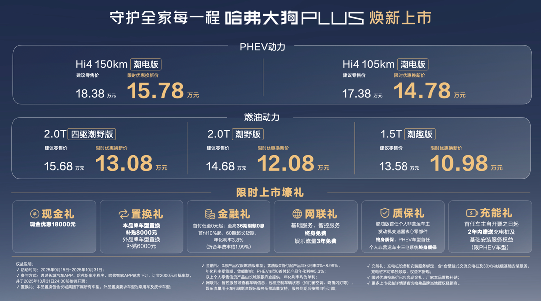 为了让消费者更好地选到自己心仪的车型,全面满足用户的全场景用车需求,哈弗大狗PLUS共推出两种动力五款车型,其中燃油版限时优惠换新价10.98-13.08万元,PHEV版限时优惠换新价14.78-15.78万元。