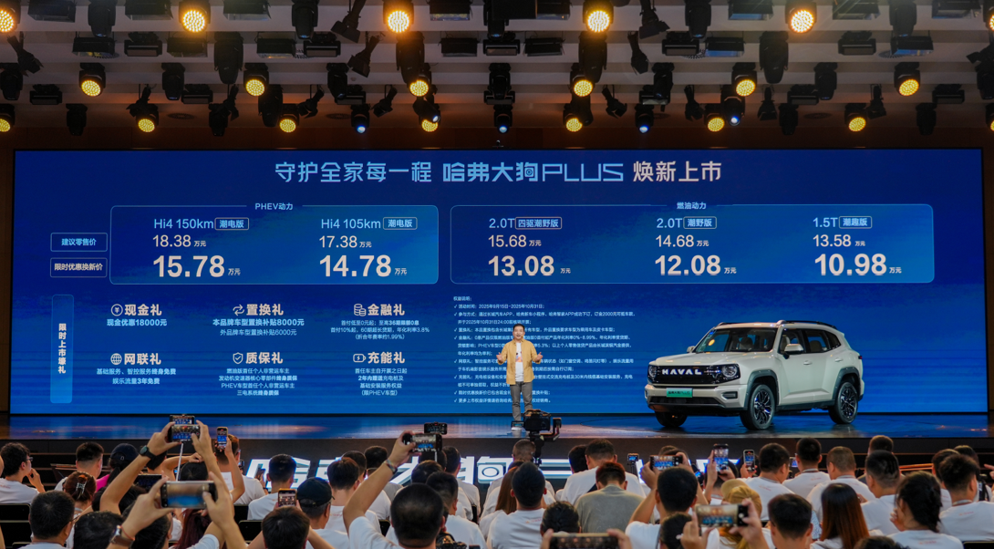 《车尚时刻》新媒体获悉,9月15日,哈弗品牌以“守护全家每一程”为主题,隆重举办哈弗大狗(参数|询价)PLUS上市发布会,以满满诚意致敬家庭用户。作为行业首款专注家庭需求的泛越野中型SUV,哈弗大狗PLUS真正实现“上市即交付”,诚意推出PHEV版和燃油版两种动力共5款配置车型,限时优惠换新价10.98万元起。