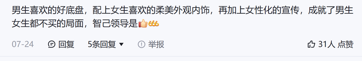 而在产品宣传的策略上,网友的眼睛也是雪亮的。有网友就评论智己明明是有着男性用户喜欢的底盘技术,却一味往女性化方向宣传,导致智己落得一个男女都不买的局面。
