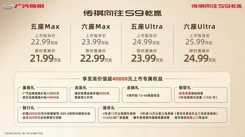 传祺向往S9乾崑上市指导价22.99万元起,可选五六座,满足不同用户购车需求。同时还为用户准备了六大诚意十足的上市礼包,综合价值超40000元。
