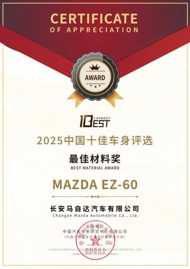 关于这一点,MAZDA EZ-60给出范式新答案,这款在9月26日将正式登场的合资新能源SUV,不讲故事、不跟风、不堆料,刀刃向内,深修内功,凭借硬核品质全面突围。日前,该车型荣获“2025中国十佳车身”和“最佳材料奖”两项重磅大奖,引发业内高度关注,冲上流量高峰。