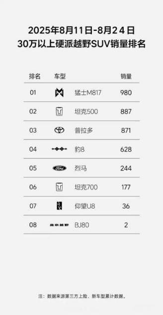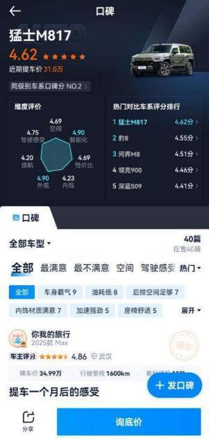 作为冠军之选,猛士M817表现同样不俗,刚一上市就斩获销量冠军,收获众多赞誉,在豪华电动越野细分赛道中销量与口碑双双登顶。