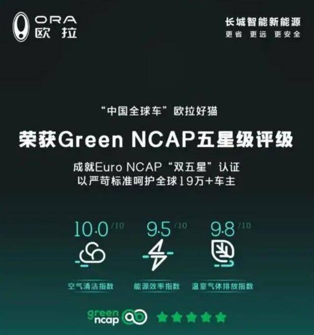 在欧洲市场,欧拉好猫(参数|询价)在新车环保节能评级机构Green NCAP测评体系中,以平均97%的分数获得了五星评级,并且还是全场最高分。