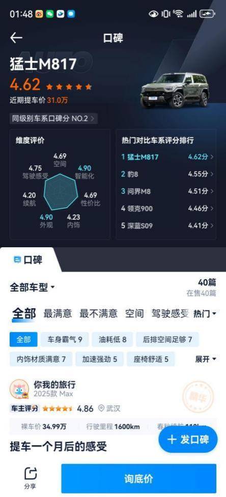 作为冠军之选,猛士M817表现同样不俗,刚一上市就斩获销量冠军,收获众多赞誉,在豪华电动越野细分赛道中销量与口碑双双登顶。