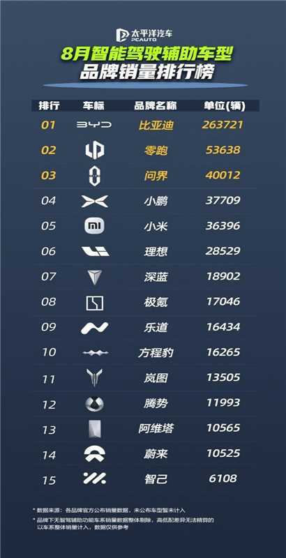 在太平洋汽车发布的8月智能驾驶辅助车型品牌销量榜中,比亚迪以26.37万辆一骑绝尘,其销量相当于第2至第10名品牌之和。