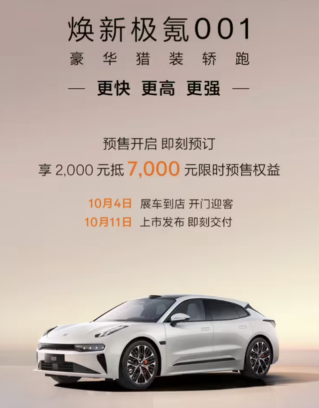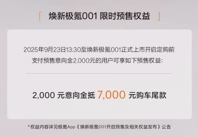 即日起至10月11日上市前,用户支付2000元预售意向金可享2000元抵7000元购车尾款的限时权益,相当于直接优惠5000元。此外,极氪官方承诺展车将于10月4日起陆续抵达全国门店,消费者可提前体验实车质感与智能座舱。