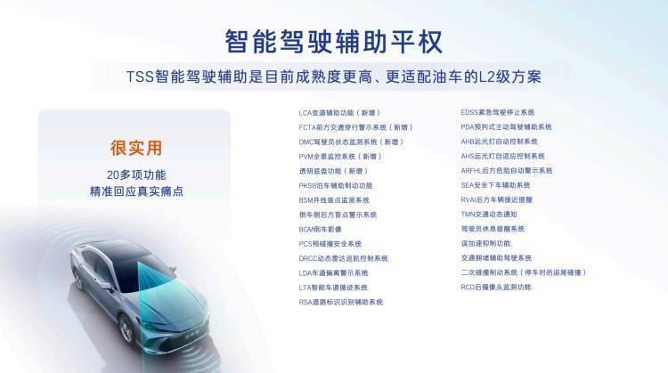 其次是智能驾驶配置,从入门锋兰达到旗舰赛那,全级别配备丰田TSS智能驾驶辅助,覆盖高速、城区、泊车三大场景。基于全球1000亿公里智能驾驶零事故大数据,匹配"安全第一"的开发策略,让安全智能驾驶无需妥协。丰田TSS智能驾驶辅助以最实在的全系标配、全场景覆盖,给出了"智能驾驶平权"的答案。