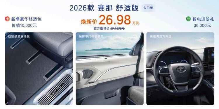赛那主打"豪华不分级别"。入门焕新价26.98万元起。并新增"四驱臻享版",将雷克萨斯LM(参数|询价)同款头等舱座椅与E-FOUR电子四驱合并推出;头等舱座椅融合16点气动按摩、三档通风加热,采用半苯胺奢华真皮材质,上下车扶手升级打孔皮革包覆及镀铬装饰。新增赛铂金外观、醇厚棕内饰、"羽翼"迎宾灯、PVM全景监控系统+透明底盘功能。静谧性更媲美顶级豪车,120km/h时速下车内噪音低至61.8分贝。2026款赛那做到了"30万级定价,百万级体验"。"四驱臻享版"最终焕新价33.98万元。