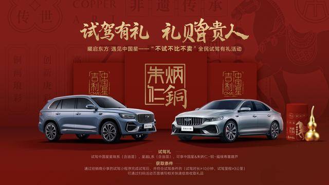 即日起至12月31日,针对购买中国星星瑞全系、星越L全系用户,每月将在第三方检测机构的监督与公证下,抽取300名幸运用户免费赠送中国星东方曜限量定制款MEIZU 22手机。此外,吉利中国星还携手中国非遗铜雕文创品牌——朱炳仁·铜,发起“试驾有礼,礼赠贵人” 不试不比不卖全民试驾有礼活动,到店试驾中国星星瑞、星越L系列车型,即可获赠由“朱炳仁·铜”匠心打造的【福禄寿喜葫芦挂件】一份。