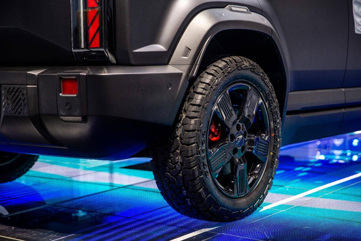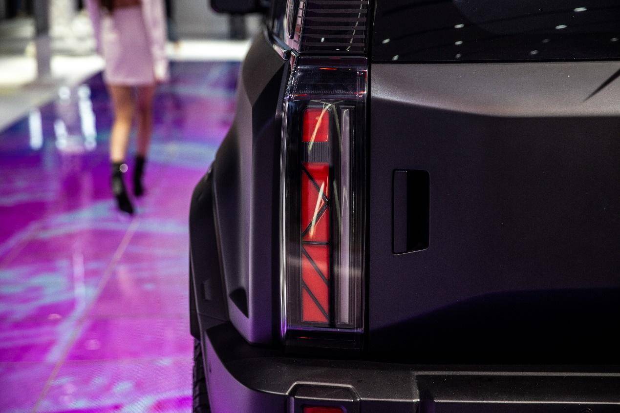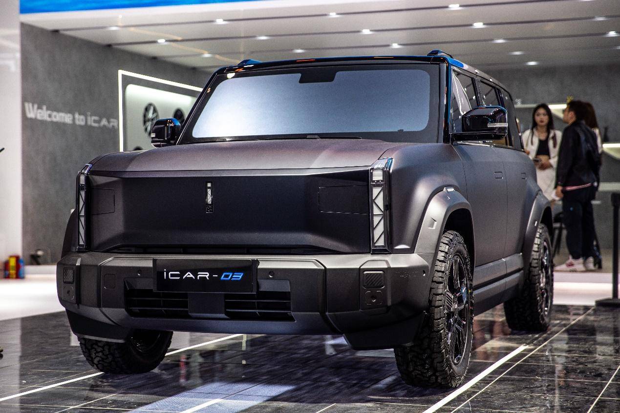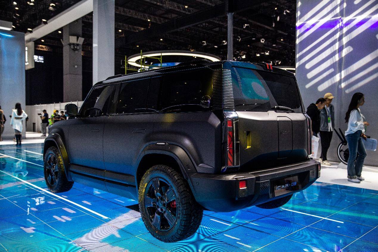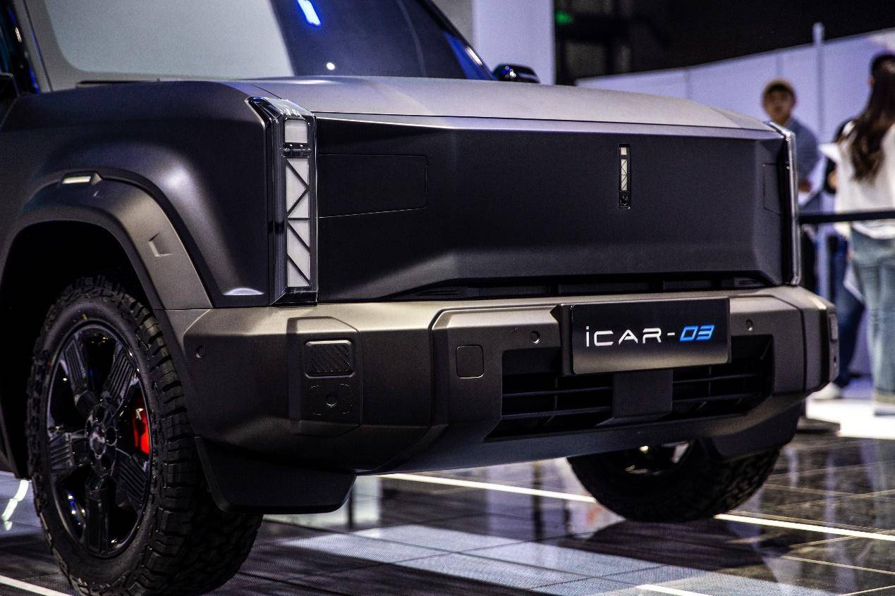 根据现场图片来看,iCAR 03整体设计造型硬朗,大量的平直线条勾勒出传统的硬派越野车形象。与此同时,封闭式进气格栅设计、隐藏式门把手、新颖灯组语言等元素,时时刻刻提醒着消费者,其纯电车型的身份。