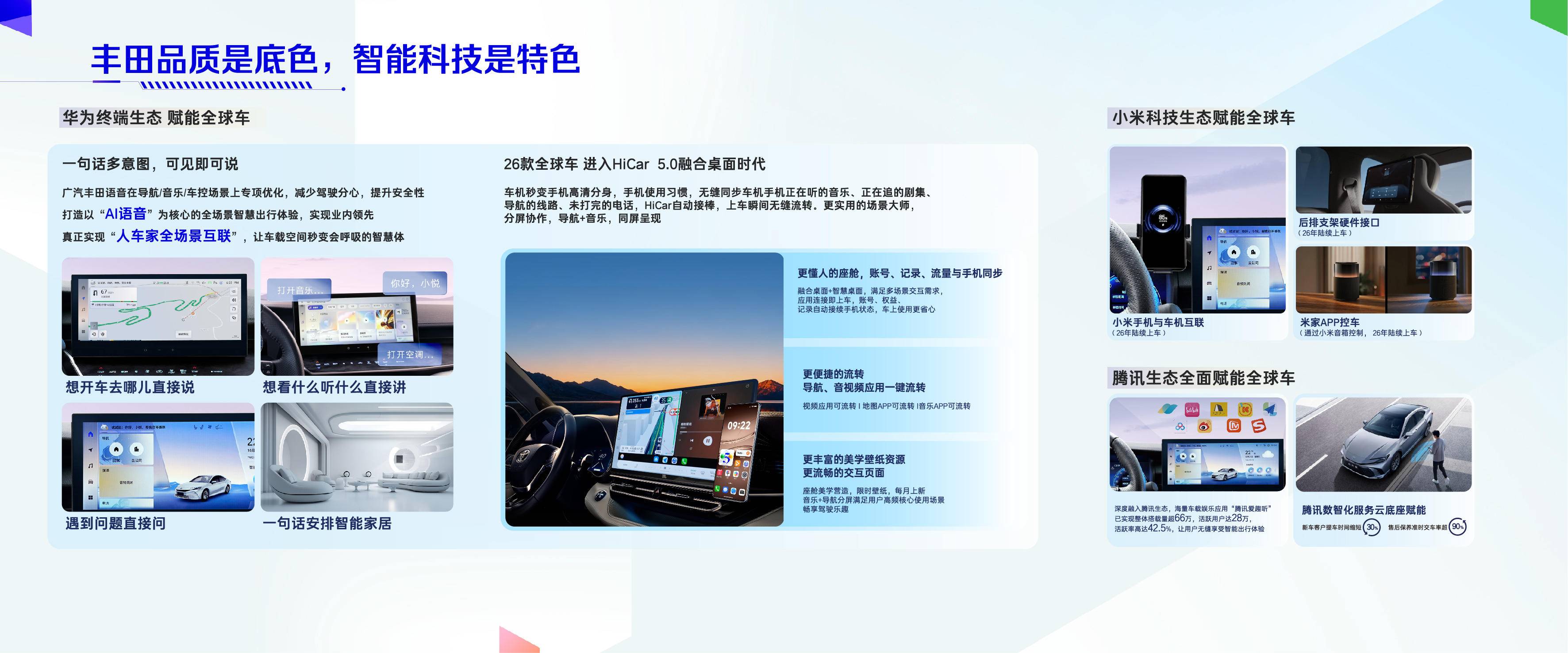 广汽丰田不是没有意愿去做智能,只是一款全球车要完成车机端的本土化改造,从硬件到软件都要投入大量时间精力,通用和福特为此在中国建立了专门的软件中心。丰田和华为的合作也在好几年前就开始了,但直到2026款搭载的HiCar 5.0,才完成了兼容性等方面的调整,实现跨端融合,可见即可说,车手互联,等等。