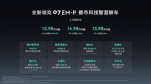 全新有为,极智新境。9月25日,都市科技智混轿车——全新领克07(参数|询价) EM-P正式上市。新车共推出126长续航Max、126长续航Ultra、126长续航Ultra H7三款配置版本,上市限时价13.98万元起。同时,全新领克07 EM-P还准备了限时领享金、超享焕新礼、选配礼、金融礼、智行礼、补能礼、无忧臻享礼、交车礼在内的8重限时福利。