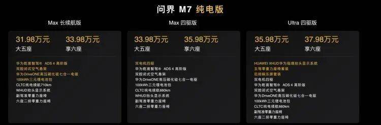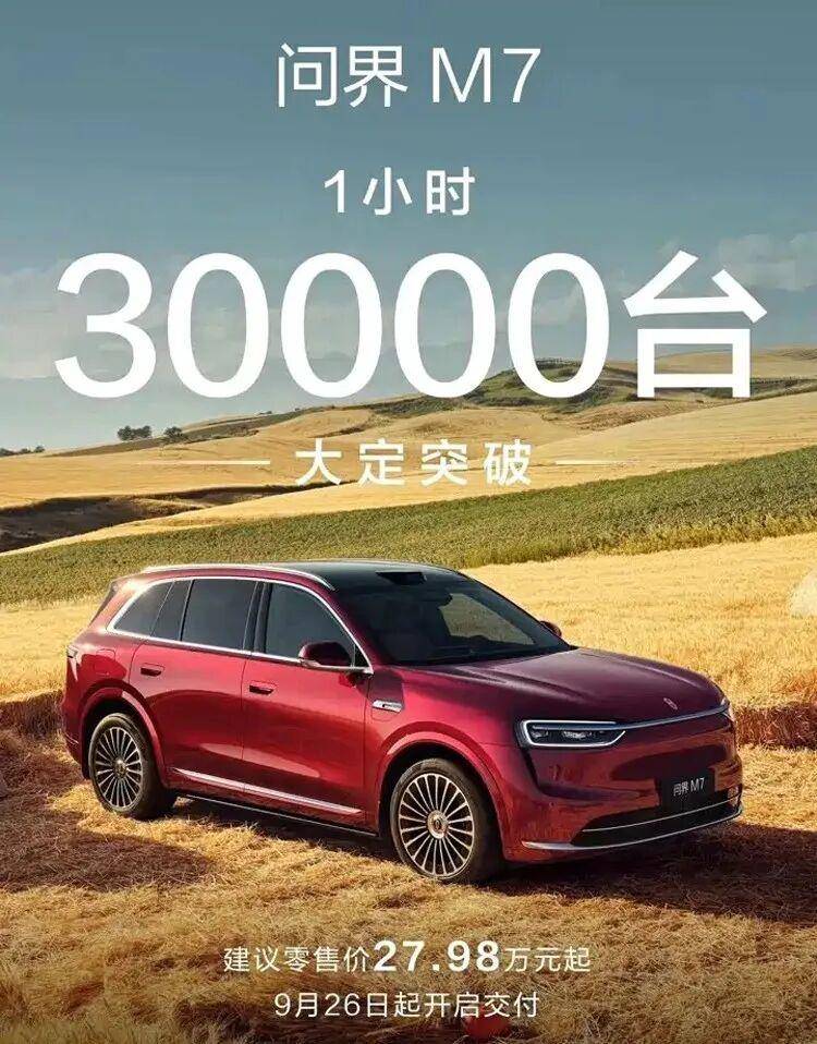 全新问界M7(参数|询价)目前正式上市,新车推出5座/6座两种座椅布局以及纯电/增程两种动力形式,共计12款车型,官方指导价27.98-37.98万元。值得一提的是,新车上市一小时,大定突破3万台,有望成为鸿蒙智行(参数|询价)最走量车型。