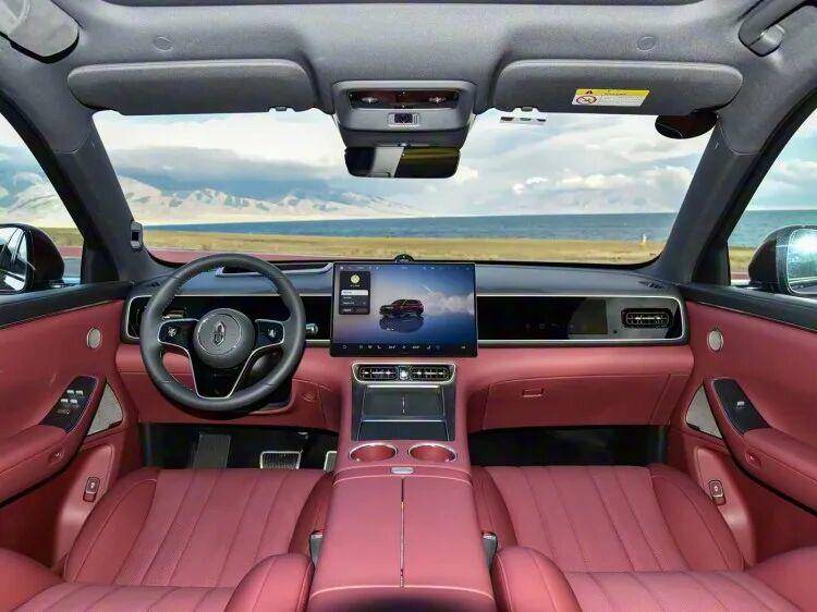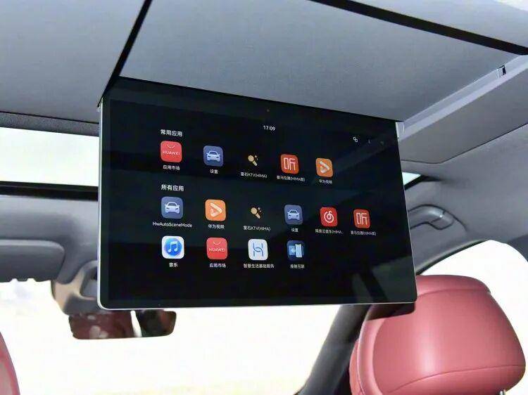 内饰采用区别于问界M8的全新设计,带来星云红、韶华杏、赤茶橘与松露棕四种内饰颜色。中控台使用了全液晶表盘+16.1英寸中控屏+10.25英寸副驾屏三屏组合,更配有大尺寸AR-HUD以及17.3英寸的后排吸顶屏。