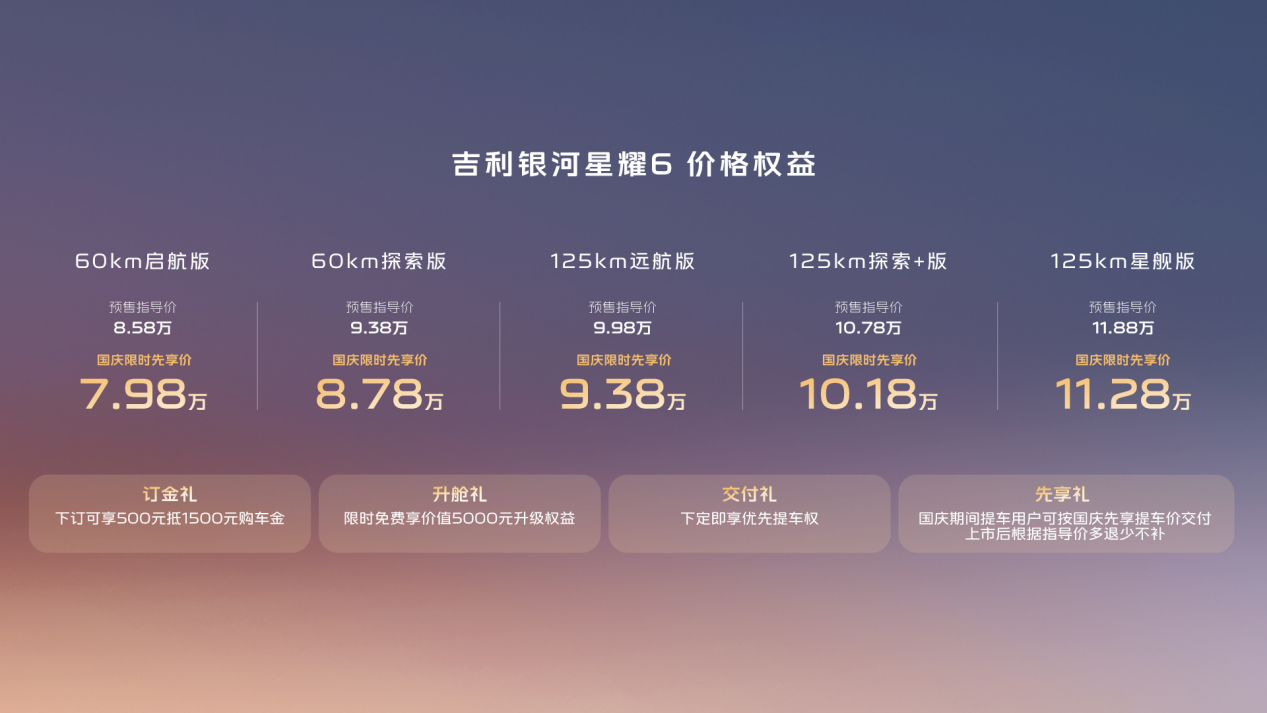 9月26日,吉利银河旗下首款“多能源形式”车型——银河星耀6在深圳正式开启全球预售,同步启动全国媒体试驾。这款被定位为“划时代电混家轿引领者”的新车,不仅以7.98万元起的国庆限时先享价击穿同级价格底线,更凭借“好看、好省、好开、好舒适、好智能、好安全”的六大全能产品力,为消费者“人生第一台车”提供了无需妥协的新选择。
