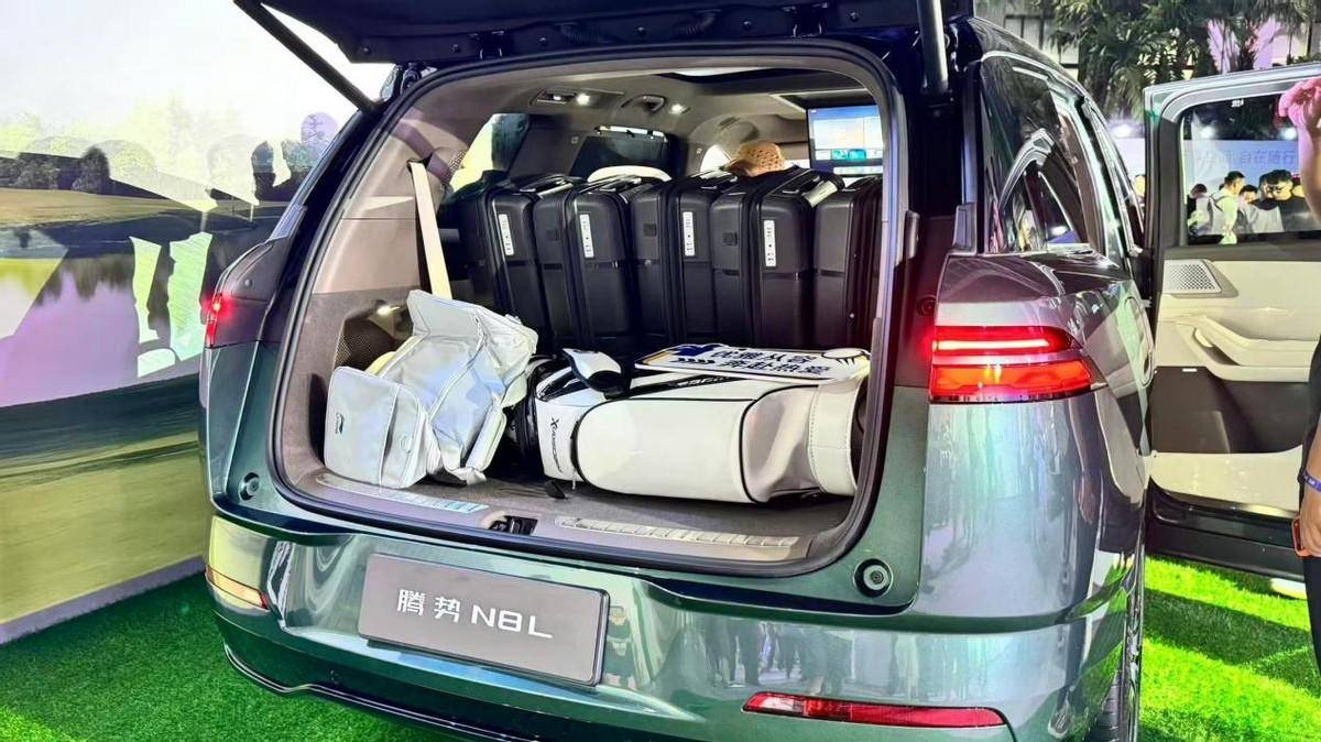 所以空间表现仍然是腾势N8L的核心卖点。新车在腿部、肩部和头部空间都优于其他“8”字辈车型。第三排支持前后100mm滑移,配备座椅加热与独立空调出风口,实用性较强。全车三排座椅均为电动调节,支持4+N种灵活布局。车内设49处储物空间,后备厢最大可扩展至1128L,并带有一处51升的隐藏储物格。