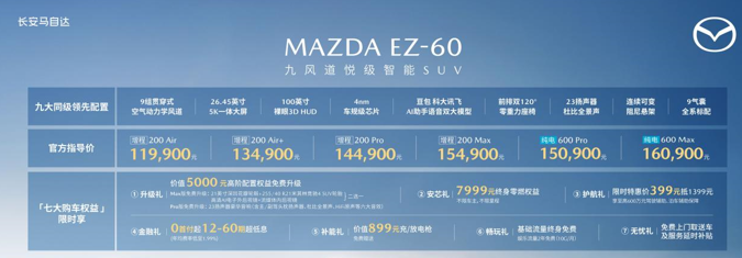 自上海车展全球首秀以来,EZ-60成为热度最高的新能源中型SUV之一。为回馈广大用户的支持与信赖,长安马自达推出了7大专属购车权益。