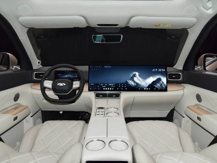 内饰兼顾科技和豪华,首先中控台用线条勾勒出一定的层次感,比较惹眼的就是中控屏与副驾屏合为一体式的30英寸的大屏造型,配合内嵌式全液晶表盘、大尺寸的AR-HUD,进一步强化其科技感。车机系统支持AI大模型语音助手,全车六个座位都可以语音控制。