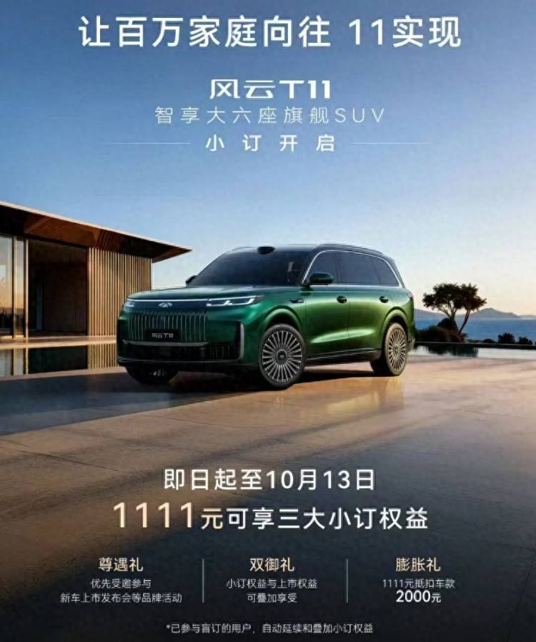 此前在成都车展首发亮相的奇瑞风云T11目前正式开启小订,即日起至10月13日,1111元可享三大小订权益。奇瑞风云T11是当下比较火的全尺寸6座SUV定位,也是奇瑞当下最大号的量产车。