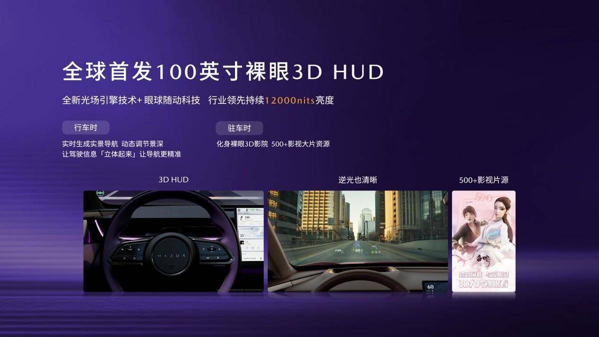最引人注目的是全球首发的100英寸裸眼3D HUD,利用SLHM空间算法实现信息分层显示,结合眼动追踪技术,有效解决传统HUD的视觉飘移问题。停车时还可化身3D影院,提供超过500部3D片源,拓展了车载娱乐的边界。