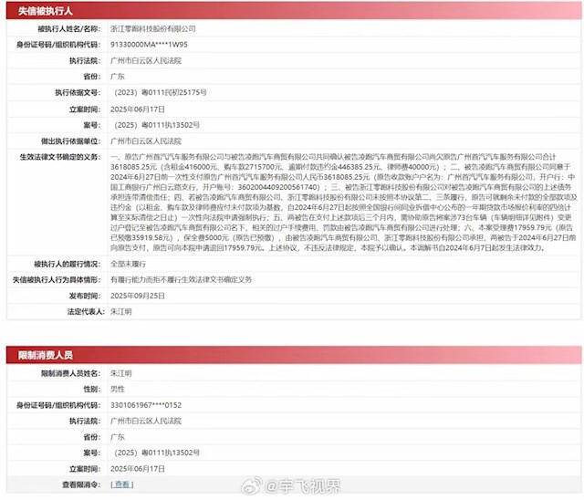零跑汽车作为母公司需承担连带清偿责任,但因“有履行能力而拒不履行生效法律文书义务”,于2025年9月25日被广州市白云区人民法院列为失信被执行人。