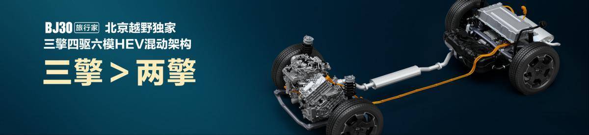 三擎混动,节能宗师!BJ30旅行家要做最省的轻越野旅行SUV,采用北京越野独家研发的“三擎四驱六模HEV混动架构”,百公里综合油耗低至5.85L,具备纯电、串联、并联、直驱、能量回收、驻车充电六大动力模式,系统会根据车速、路况、油门深度等参数,在各种模式间智能切换;搭载混动专用发动机,是保时捷同款黑科技,热效率高达41%。