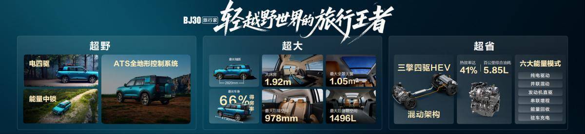 即便是轻越野旅行SUV,也需要足够专业的越野能力。BJ30旅行家要做越野能力最强的轻越野旅行SUV,搭载超级混动系统,拥有同级最大的301kW综合功率和同级最大的685N·m综合扭矩;搭载电四驱系统,响应速度仅需0.03秒,是机械四驱的3倍以上;搭载极速模式,零百加速仅需6.59秒;配备“能量中锁”和“四轮电子限滑”功能,能自动识别打滑车轮并将动力瞬间转移至有附着力的车轮,实现轻松脱困;拥有ATS全地形控制系统,提供雪地、沙地、泥地、涉水等7种驾驶模式,应对旅行之中的复杂路况。BJ30旅行家通过更高维度的技术标准来打破轻越野市场。可以说,这是对行业现有产品的“降维打击”。