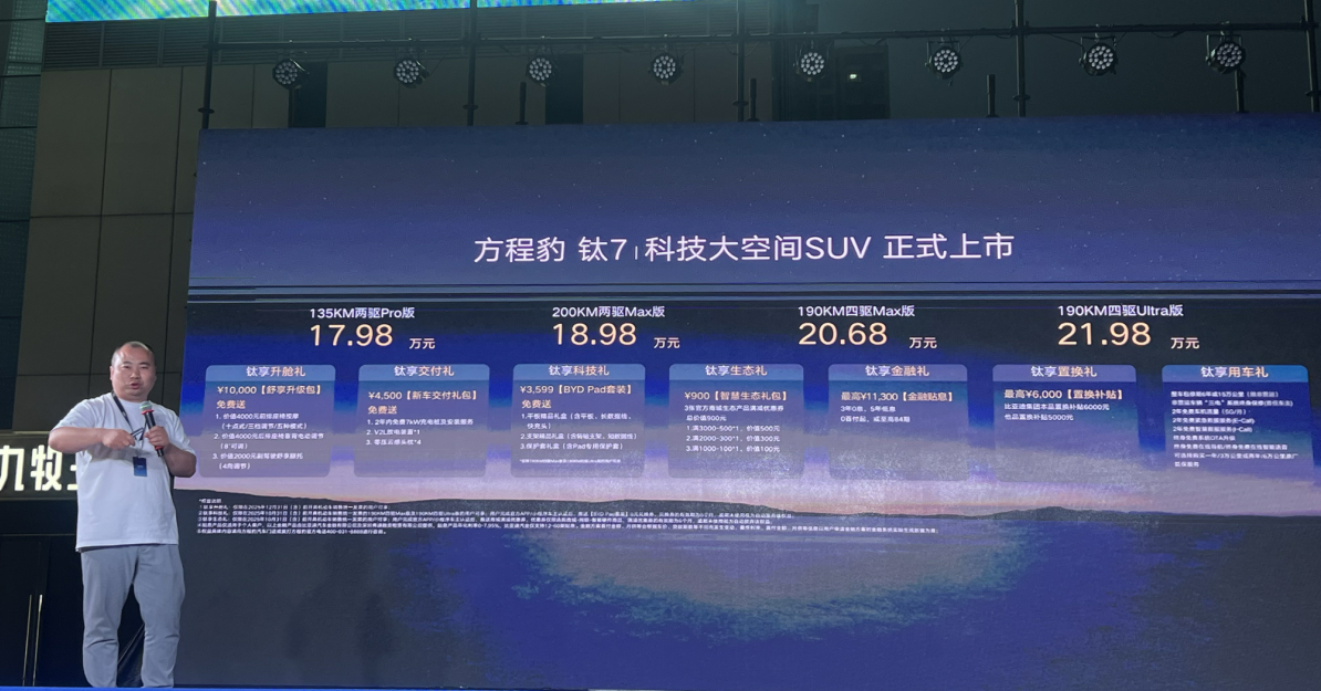 作为方程豹品牌打破 “二元对立” 的又一力作,钛 7 以大空间、高配置、强智能的核心优势,重新定义了家用硬派 SUV 标准。新车共推出4个配置版本,售价17.98万元-21.98万元:其中,135KM两驱Pro版17.98万元,200KM两驱Max版18.98万元,190KM四驱Max版20.68万元,190KM四驱Ultra版21.98万元,款款越级,款款超值,下单即刻享受最高价值超3.6万元的上市权益。
