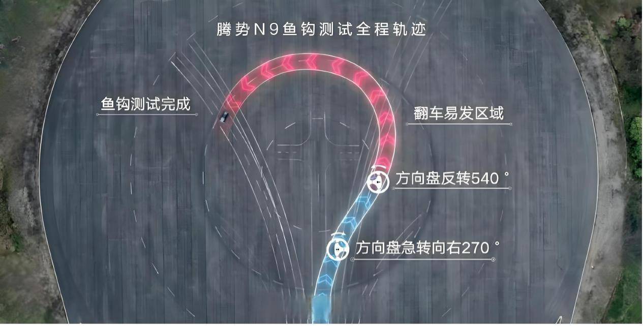 当2026款腾势N9以210km/h高速进入鱼钩测试,易三方以毫秒级的速度进行运动信息的采集,同时开始对分布式驱动、分布式制动、后轮双电机独立转向、VMC整车运动控制和云辇-A智能空气车身控制系统等执行器精准控制,使车辆在极限失控的边缘被精准纠偏,最终以四轮紧贴地面的完美姿态,成功通过测试。