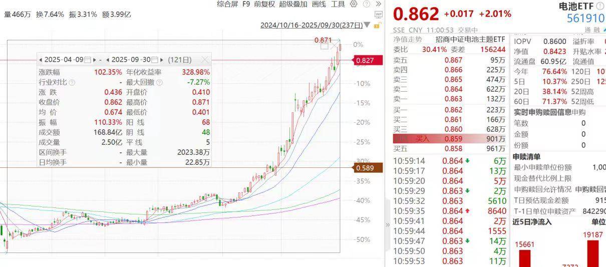 而近半年,电池ETF(561910)累计涨幅达102.35%,年化收益率更是达到328.98%,在同类产品中较为领先,