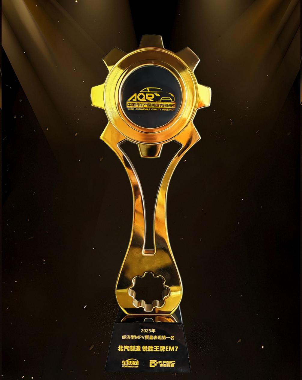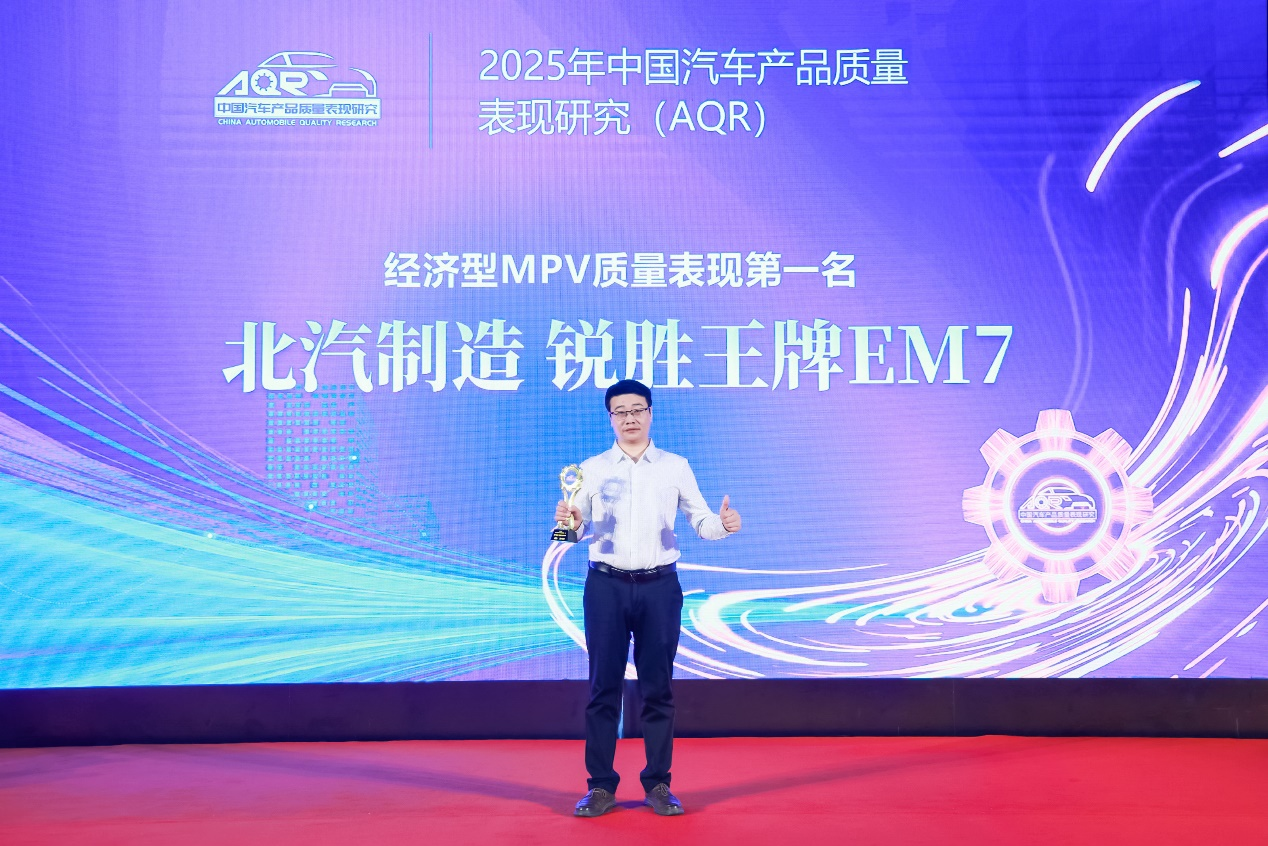 9月25日,在车质网与凯睿(参数|询价)赛驰咨询联合主办的“2025年中国汽车产品质量表现研究(AQR)结果发布暨颁奖典礼”上,北汽制造锐胜王牌E-M7凭借出色的产品质量和用户口碑,一举夺得2025年经济型MPV质量表现第一名的桂冠。这一荣誉不仅是对北汽制造产品品质的认可,更是对其始终坚持“质量本位”理念的最好印证。