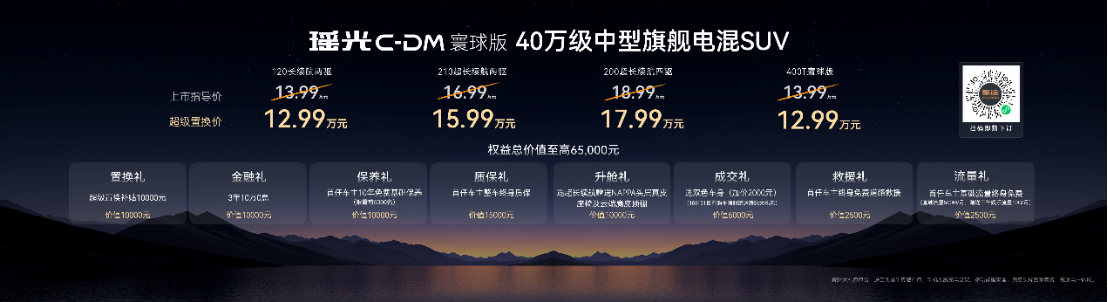新车推出3款电混版型与1款燃油版,电混版指导价13.99万-18.99万元,叠加补贴后最低12.99万起;燃油版瑶光400T寰球版同步上市,指导价13.99万元。同时带来价值6.5万元权益礼包,含1万元置换补贴、终身质保、10年免费基础保养等硬核福利,进一步拉低豪华出行门槛。