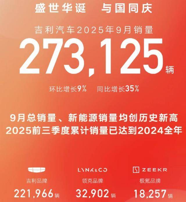 吉利汽车在九月份卖爆了,官方销量数据显示,9月销量达到273,125辆,同比增35%,创下月度销量的历史新高。其中,新能源产品销量达到165,201辆,同比增80%,吉利星愿(参数|询价)正式冲破月销5万辆大关,在新能源领域,吉利汽车的销量按下“加速键”。