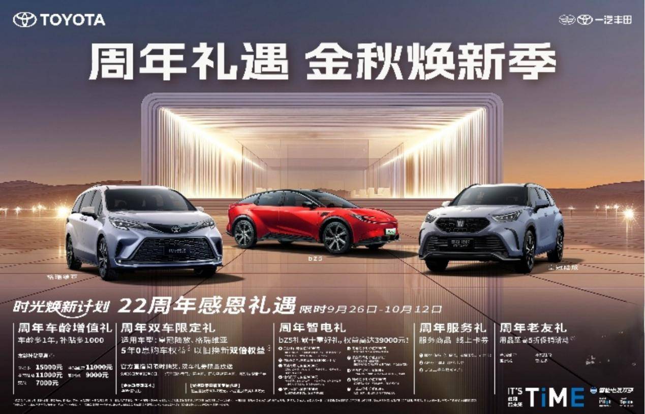 9月是一汽丰田的生日月,22年前,一汽丰田拔锚启航,开启了壮阔的发展篇章。22年间,一汽丰田累计赢得1200万用户的信赖,积累了今天应对产业变革的巨大资产;9月自然也就成了一汽丰田的“客户回馈月”。