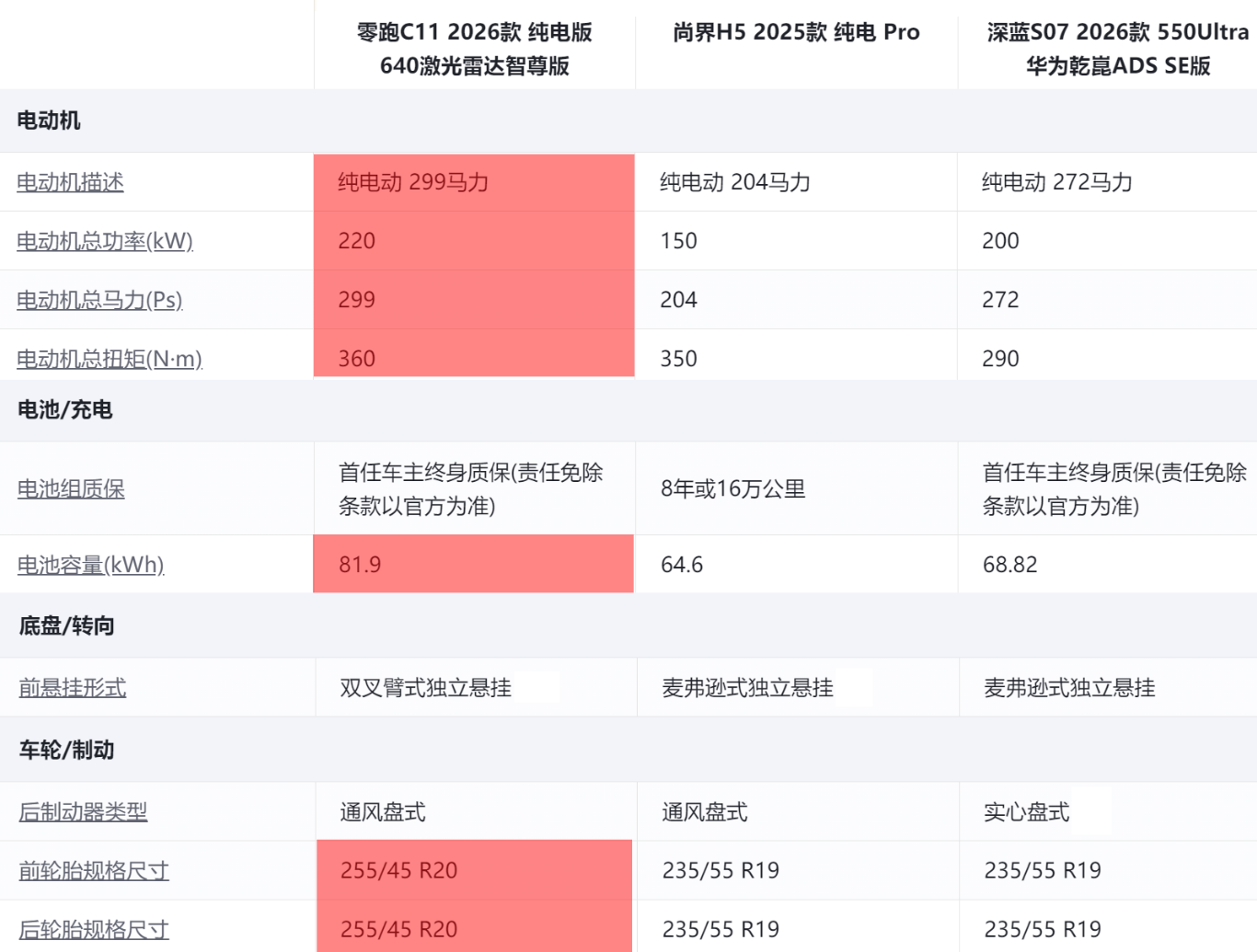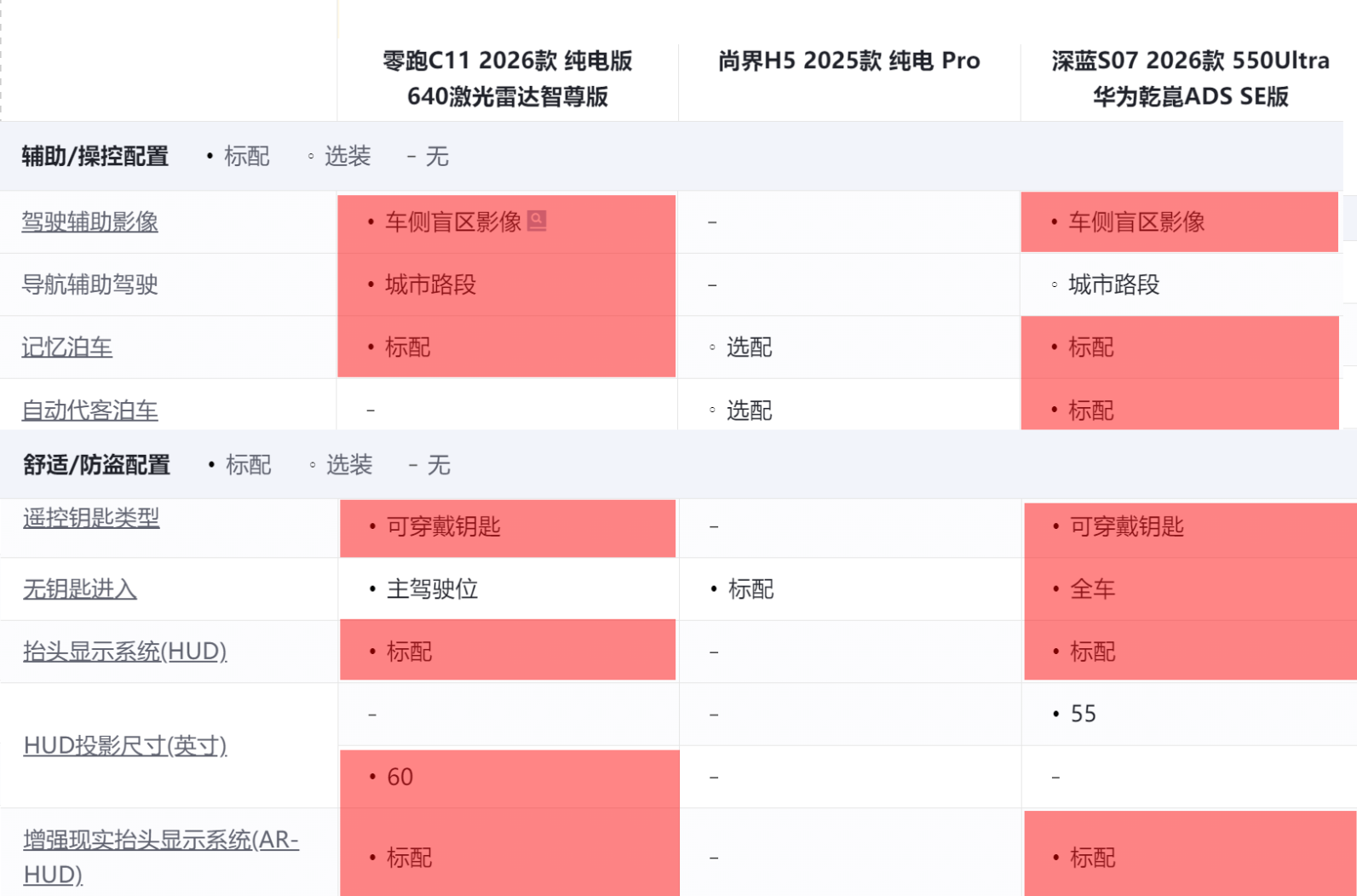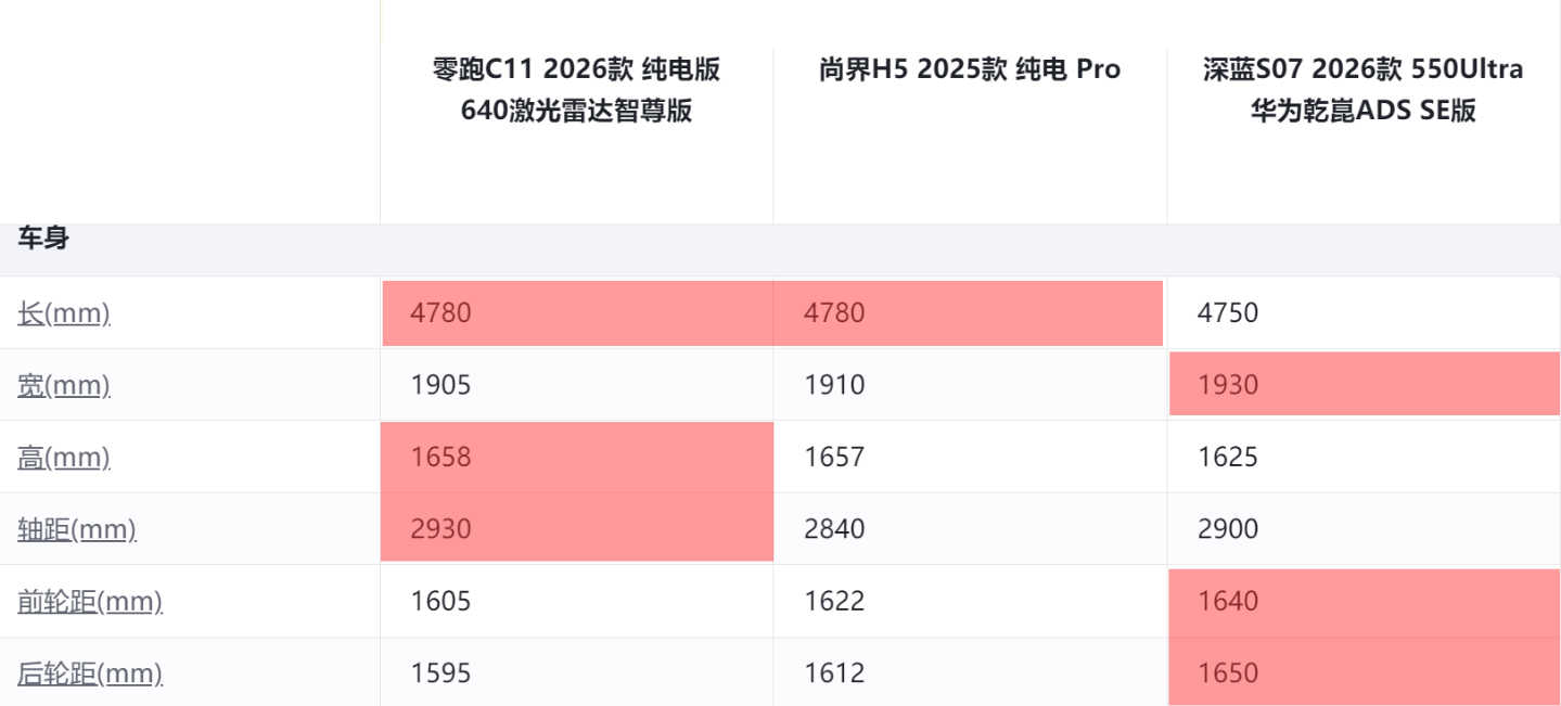 中国人虽然对精巧的东西珍爱有加,但对于担当大用的大件物品,那还是主打一个量大管饱,不能小气,大的东西他最大的优点就是大。所以别说尺寸不关键,尺寸才是家用车所要考虑的第一要素。我们选择的三款车分别是深蓝S07 2026款550 Ultra华为ADS SE版以及尚界H5 2025款纯电Pro版,还有零跑C11 2026款纯电版640激光雷达至尊版。这三者指导价格几乎一致,实际售价也相差不大,很适合对比。