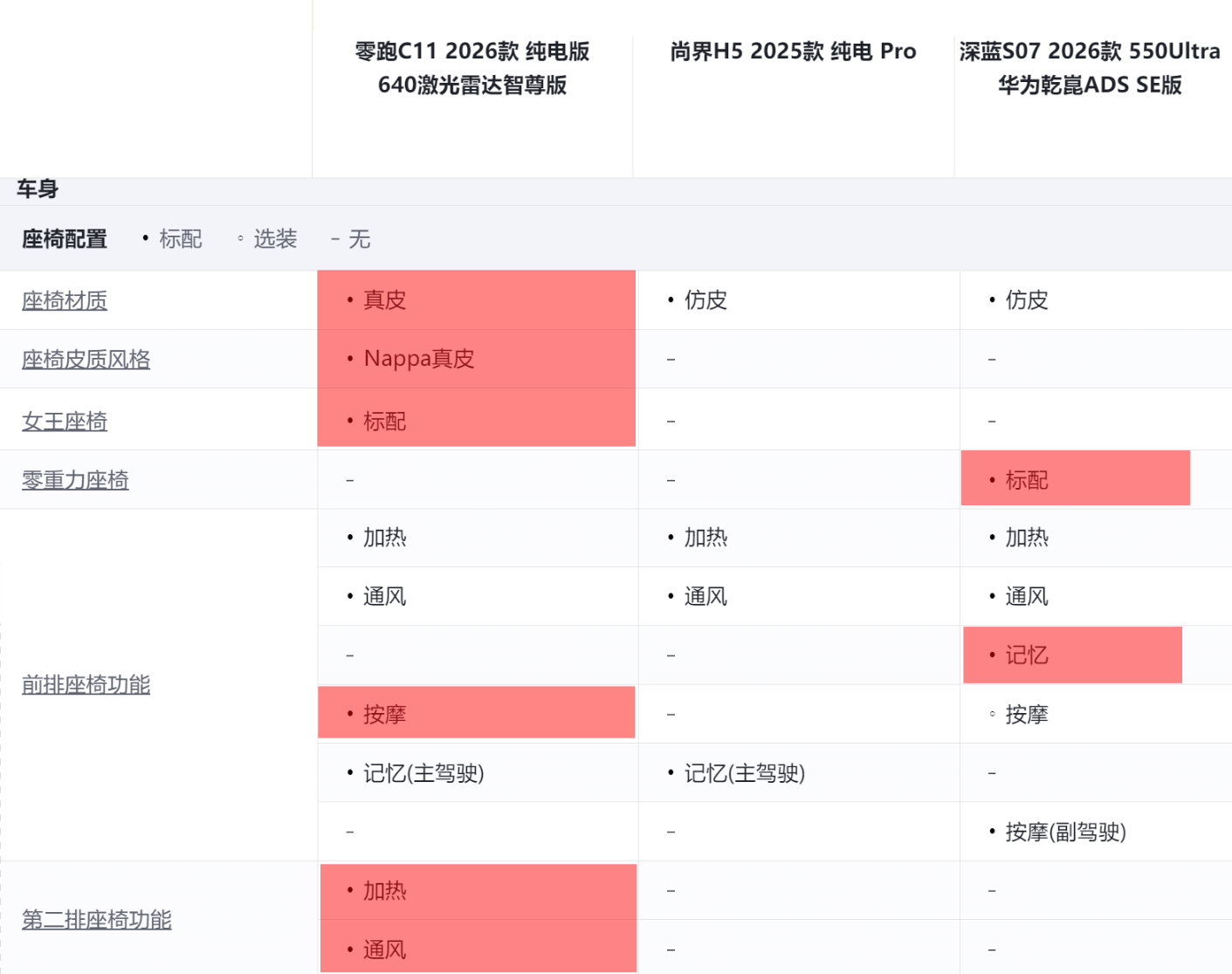 当真正对比他们的配置更能发现这个问题了,零跑C11标配了车顶行李架,也有主动闭合式进气格栅,方向盘材质也是真皮的,还有60英寸的AR-HUD。C11不但有女王(参数|询价)座椅,而且材质是Nappa真皮,另外两者都是仿皮,前排座椅部分主驾都有加热通风和按摩甚至连第2排都有加热和通风功能,另外两者是没有的。中控屏幕17.3寸最大,OLED亮度和色彩表现更好,分辨率也达到了2.8K,扬声器数量21个,功率2160瓦。尚界H5在这方面的表现就不够出色了,S07扬声器数量少了一个,但是功率更大,算是打了个平手,而且C11和深蓝都配备了主流甚至偏高的8295芯片。