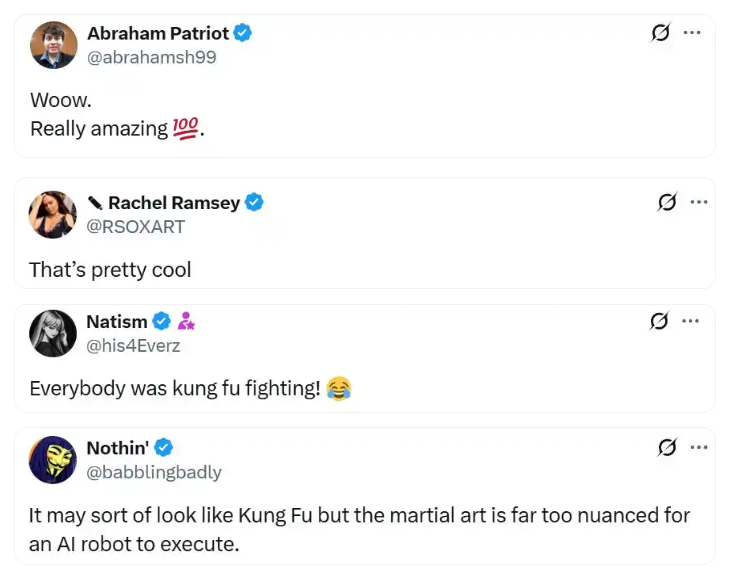 面对马斯克的回应,有些网友认为这很酷;但是也有网友认为这看起来或许有点像功夫,可是武术的精妙程度远非AI机器人所能掌握。