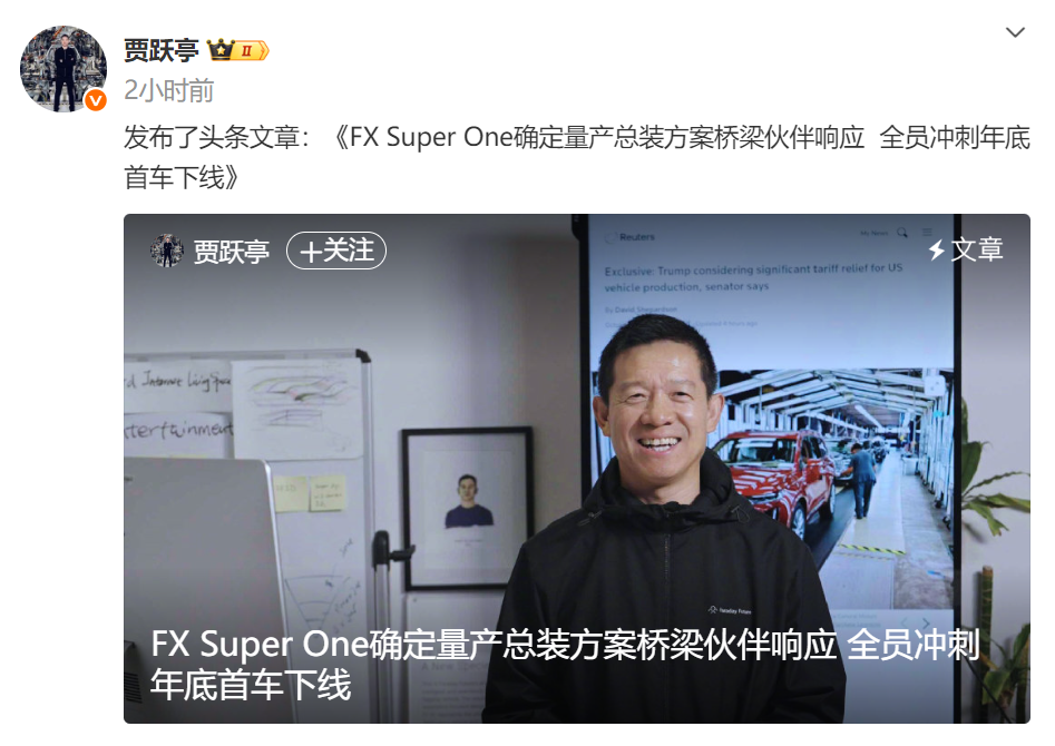 贾跃亭发文称:FX Super ONE确定量产总装方案,有望年底首车下线