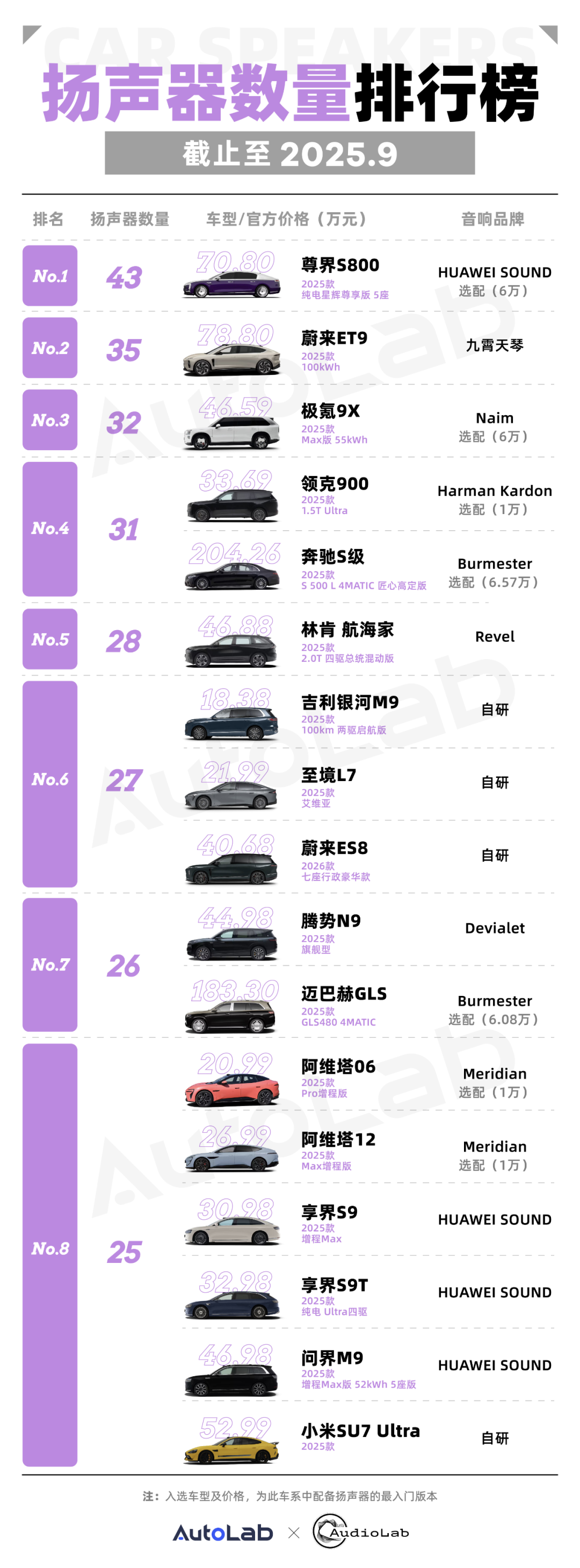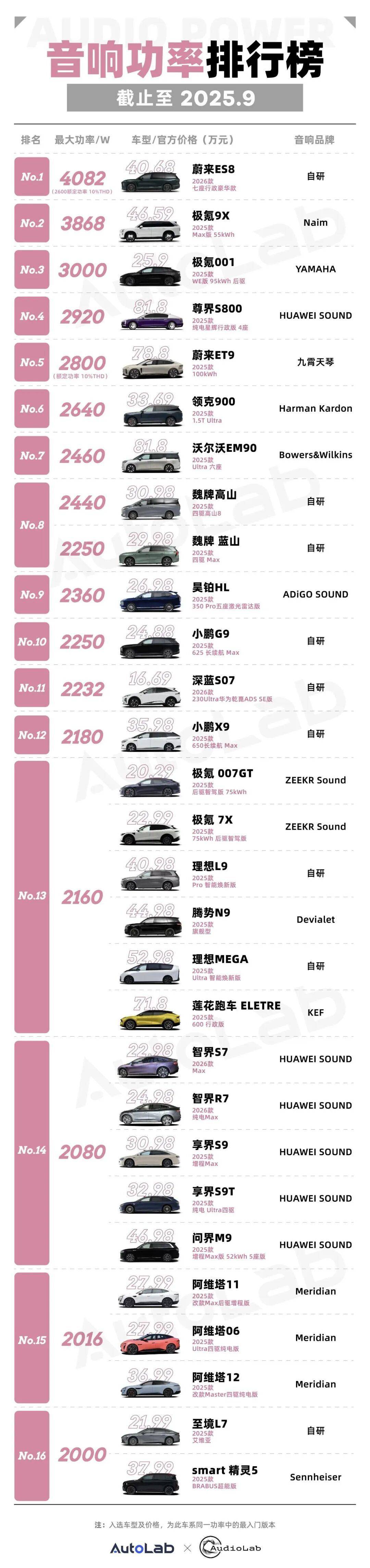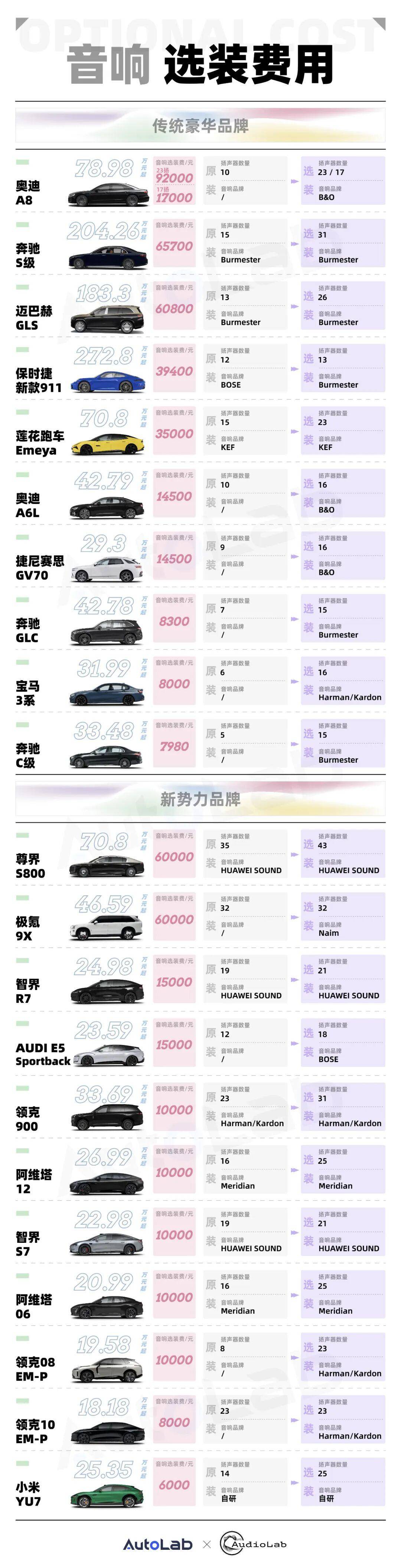 为了方便大家统一阅览并且进行对比,我们趁着十一长假将扬声器数量榜单、音响功率榜单、以及选装费用榜单汇总更新,先来一睹为快。